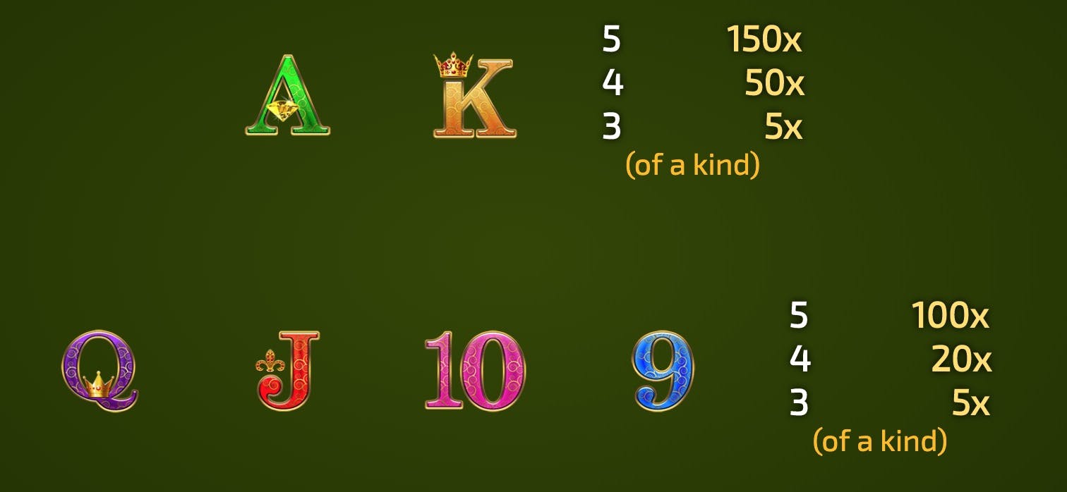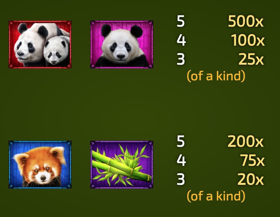 Гигантская панда и семейство панд являются высокооплачиваемыми символами, за пять матчей вы получаете до 500 монет: тигренок и бамбук дают до 200 монет за выпадение пяти на линии. Значки с более низкой оплатой — это старшие карты разного цвета, на каждой из которых изображена золотая корона. За эти значки можно заплатить 150 монет за пять значков туза или короля и до 100 монет за другие карточные символы более высокого значения.